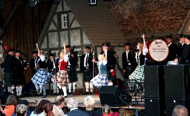 | Die "Highland Valley Pipes and Drums" eröffnen das Programm. Auch sie haben Tänzer mitgebracht! |